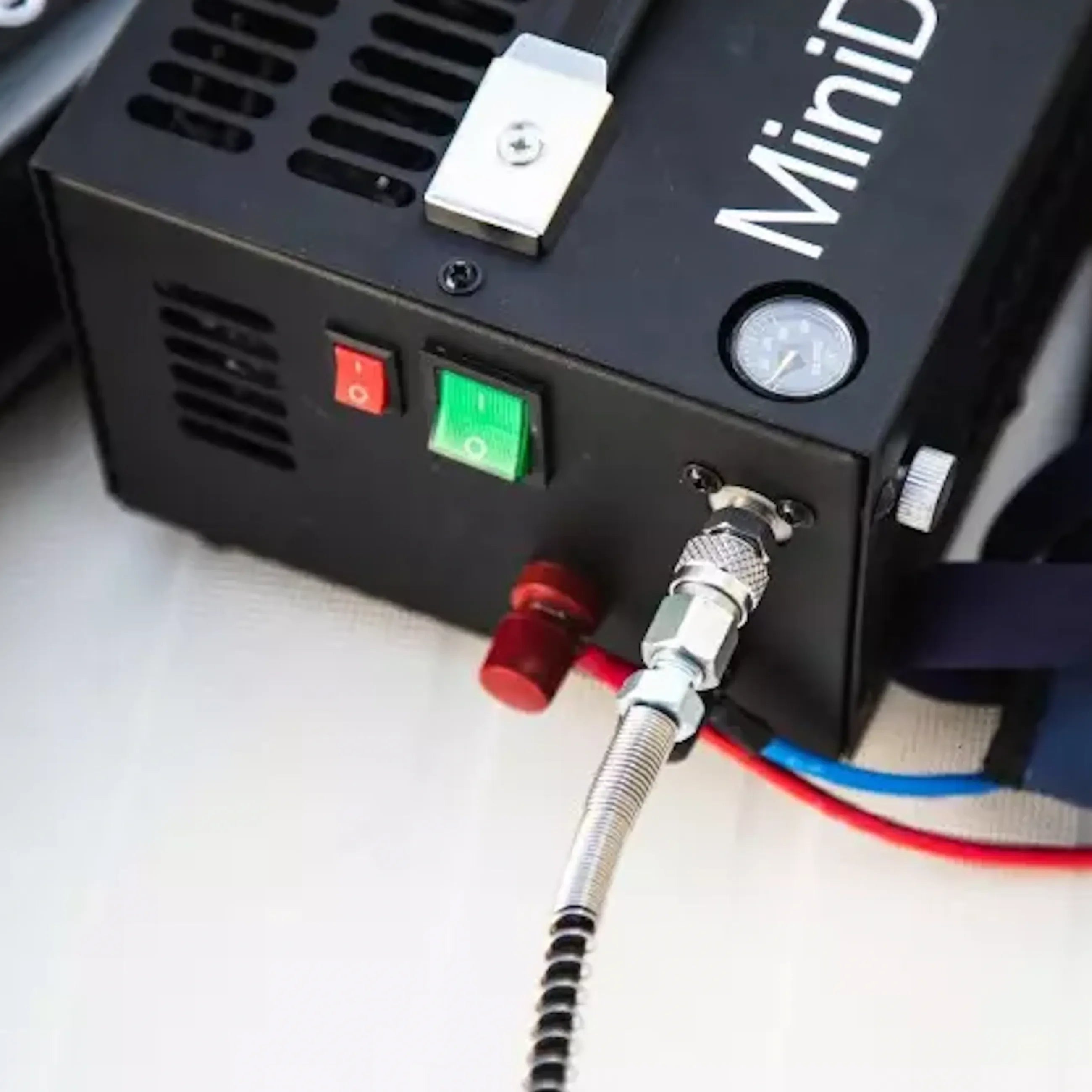 The mini electric compressor can be plugged on a 12V battery. It can fill the MiniDive Pro (0,5 L) in 15 mins just by pushing the ON button.